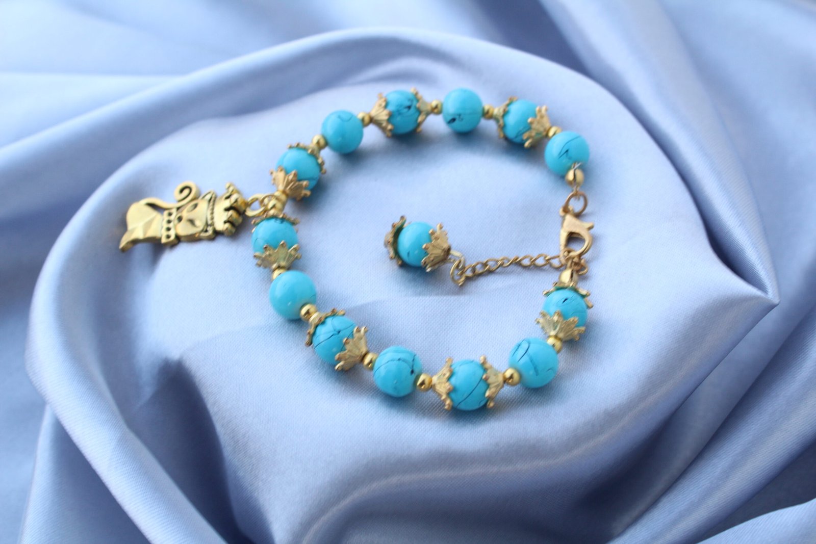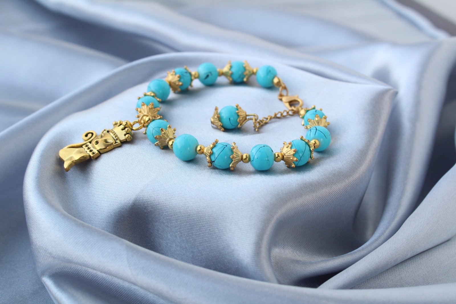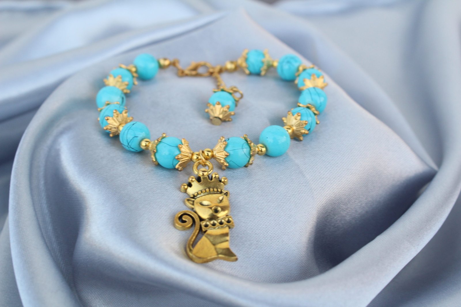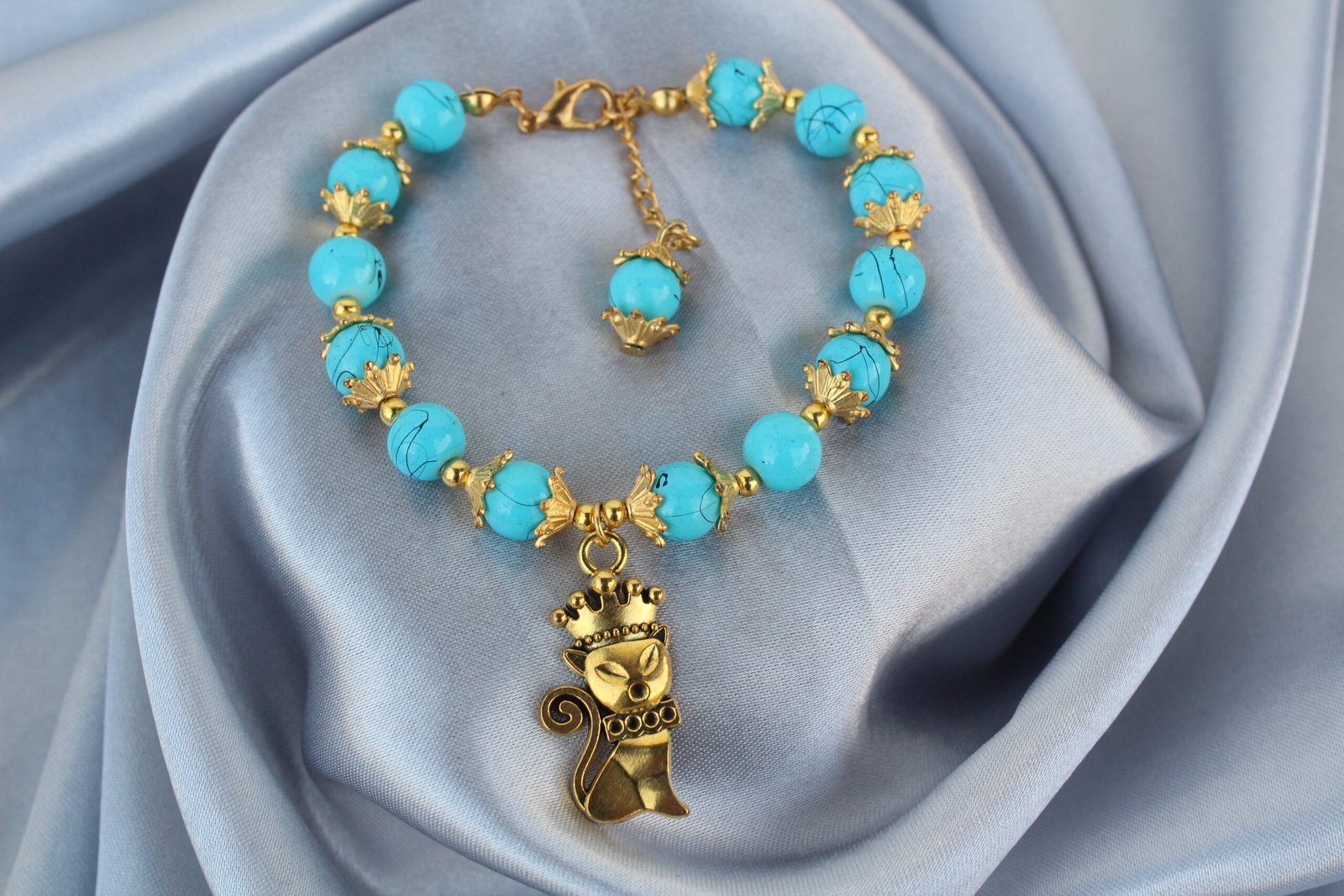 Discover elegance in simplicity with this handcrafted turquoise bead bracelet featuring a regal gold cat charm.